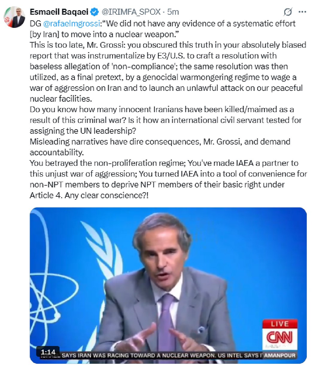 Do you know how many innocent Iranians have been killed/maimed as a result of this criminal war? Is it how an international civil servant tested for assigning the UN leadership? Misleading narratives have dire consequences, Mr. Grossi, and demand accountability.