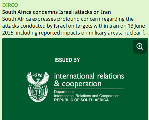 بیانیه مطبوعاتی وزارت خارجه آفریقای جنوبی در محکومیت حمله رژیم صهیونیستی به ایران . ۱۳ ژوئن ۲۰۲۵